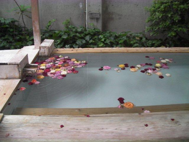 まずは薔薇のお風呂のある露天風呂へさっそく食事前に入った。