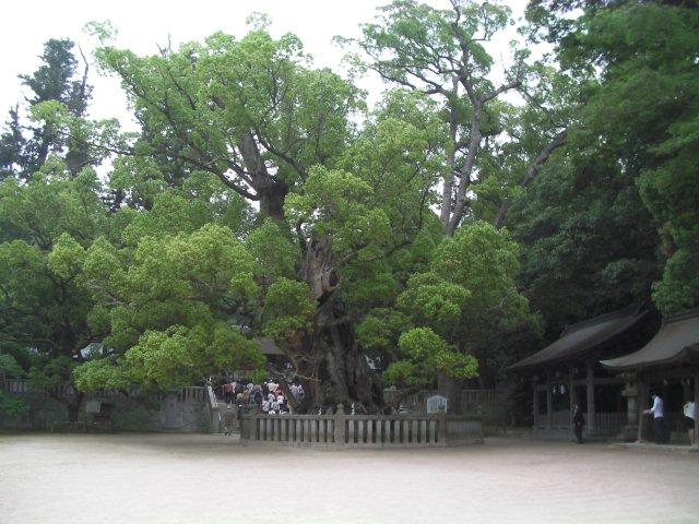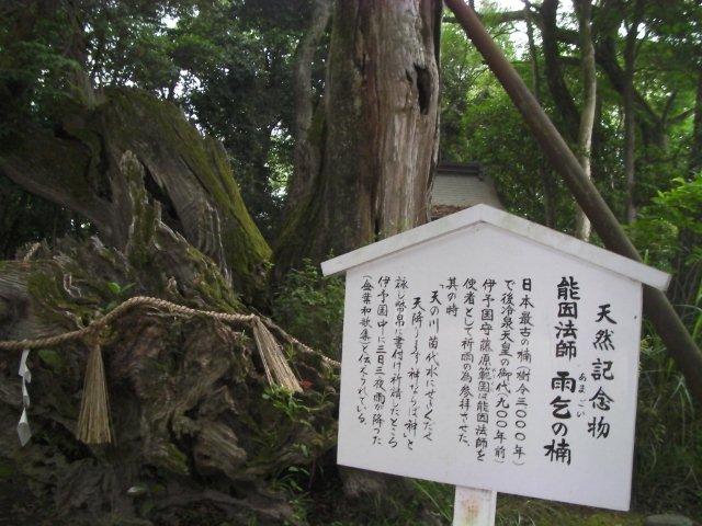 樹齢2千年の大樹にびっくり。この地に鎮座した由来としては諸説があるが、大山祇神の子孫の乎千命(おちのみこと)がこの地に築いたとする説があるとのこと。かなり古い時代から存在した神社であることは確かだ。