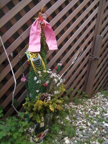 写真はフラワーアレンジメント教室で作ったクリスマスのお飾りの星やベルなどを取りはらってお正月のお飾りに変身。門の前に置いた。