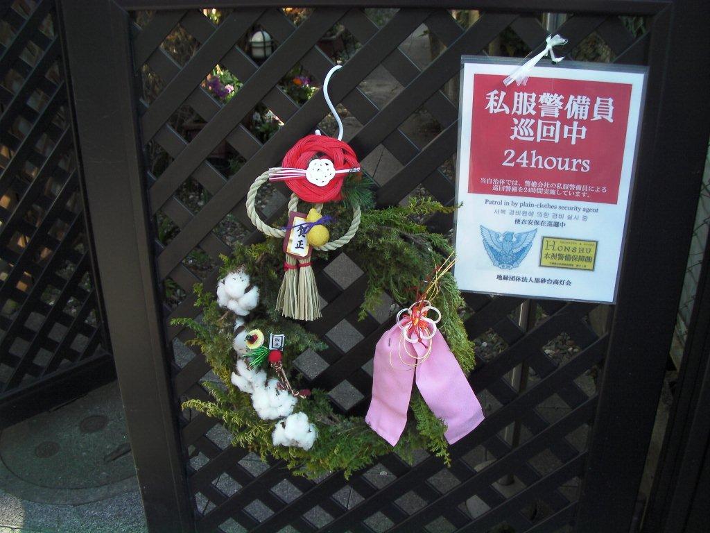 お飾りの横の「私服警備員巡回中」のポスターは我が町内会で用意したもの。