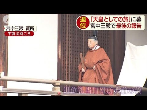陛下は賢所で拝礼し、30日、退位の儀式を行うことを報告する「御告文」を読み上げられた。その後、賢所の両隣にある皇霊殿と神殿でも同様の儀式が行われる。