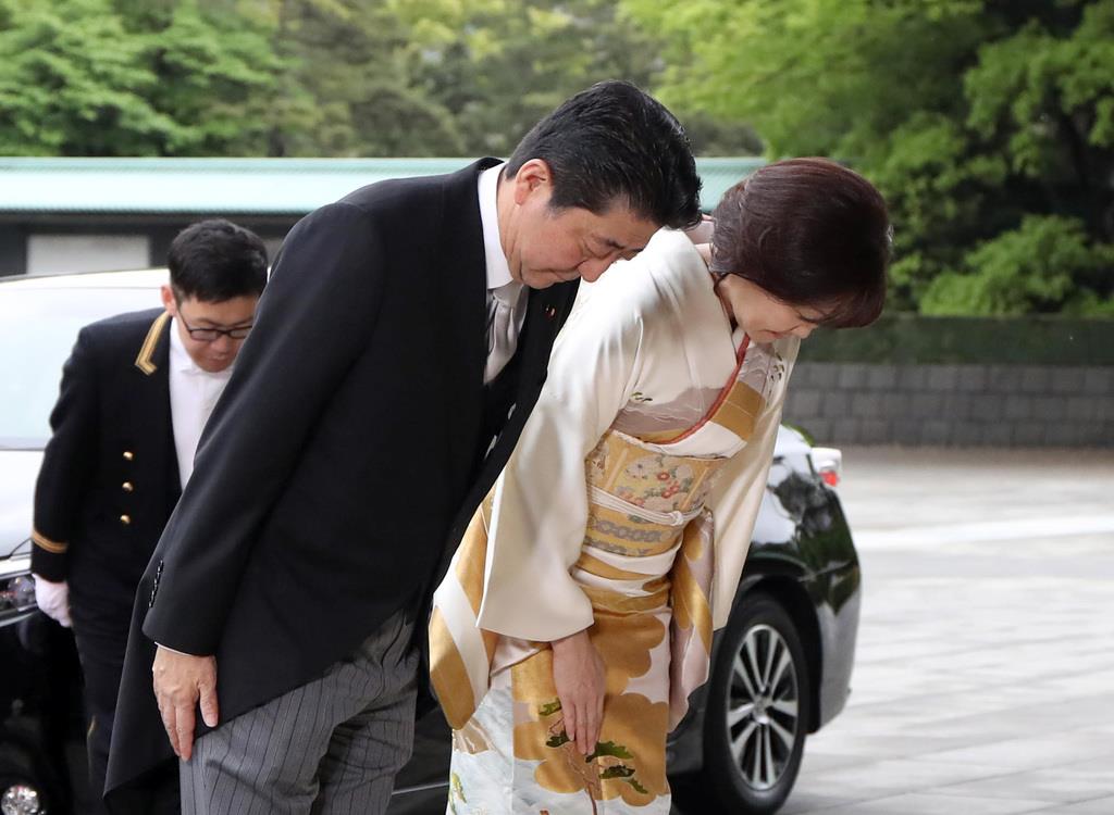 退位礼正殿の儀に出席のため一礼し、宮殿に入る安倍晋三首相と昭恵夫人=30日、皇居・宮殿(桐山弘太撮影)