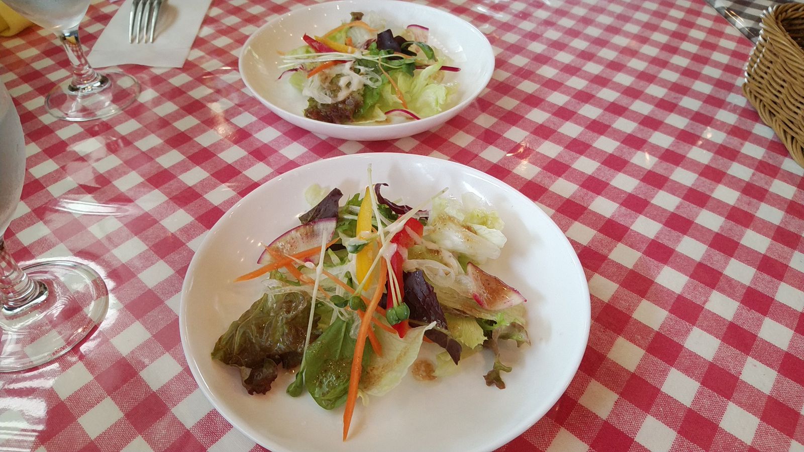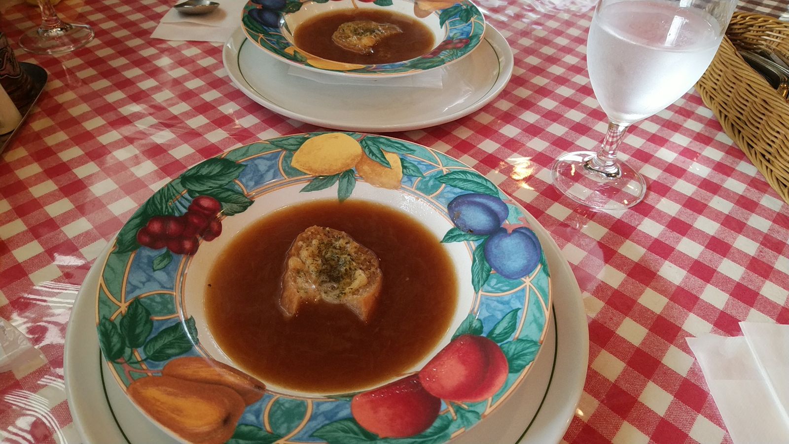 まずはオニオンスープ、熱々で美味しい、それとサラダ。