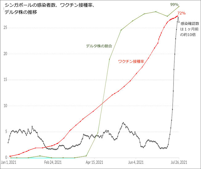 シンガポールの感染確認数とワクチン接種率(2021年1月1日 - 7月26日)