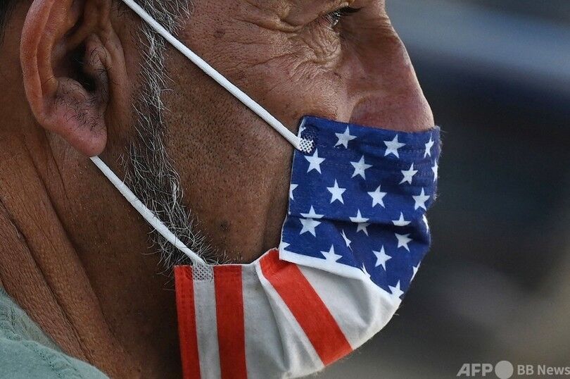 米カリフォルニア州ハリウッドで、米国旗をデザインしたマスクを着用する男性(2021年7月19日撮影)。【翻訳編集】 AFPBB News