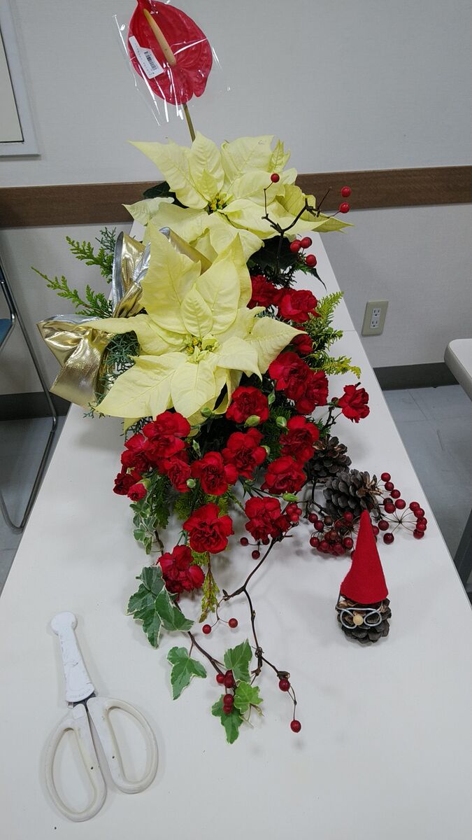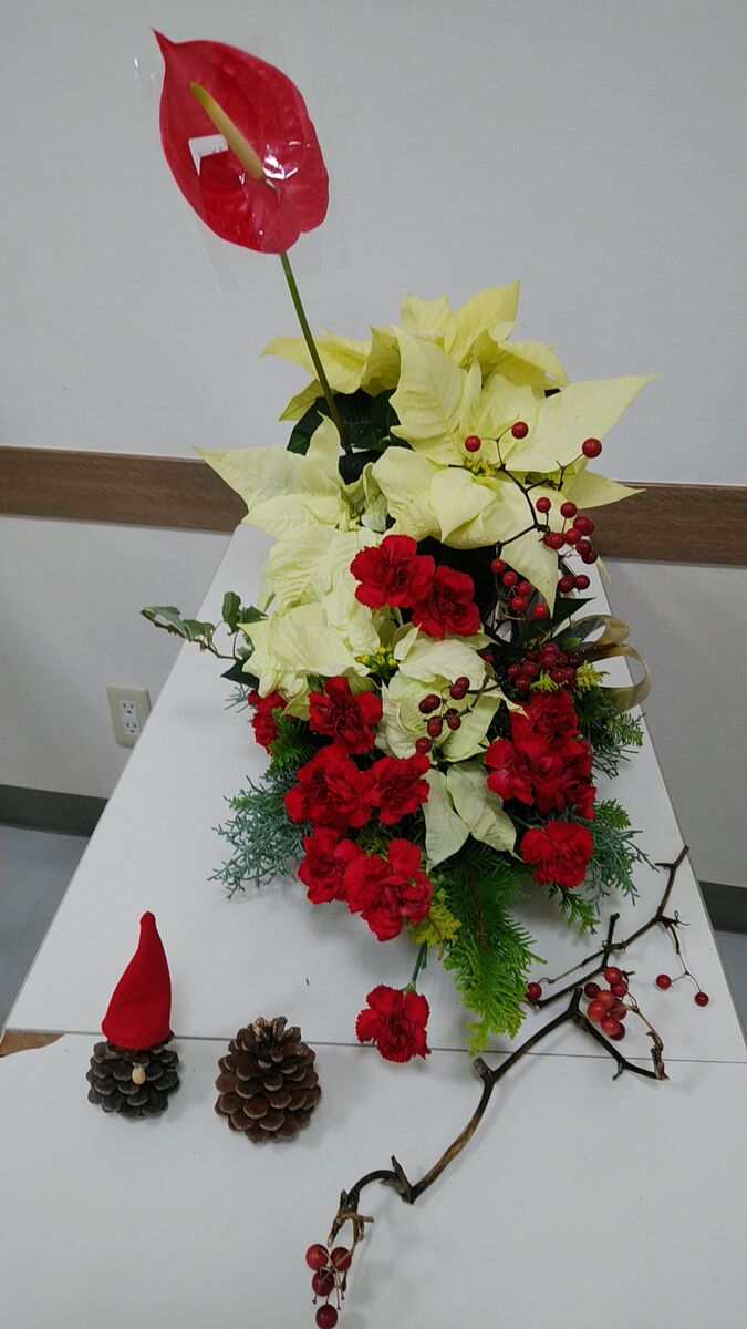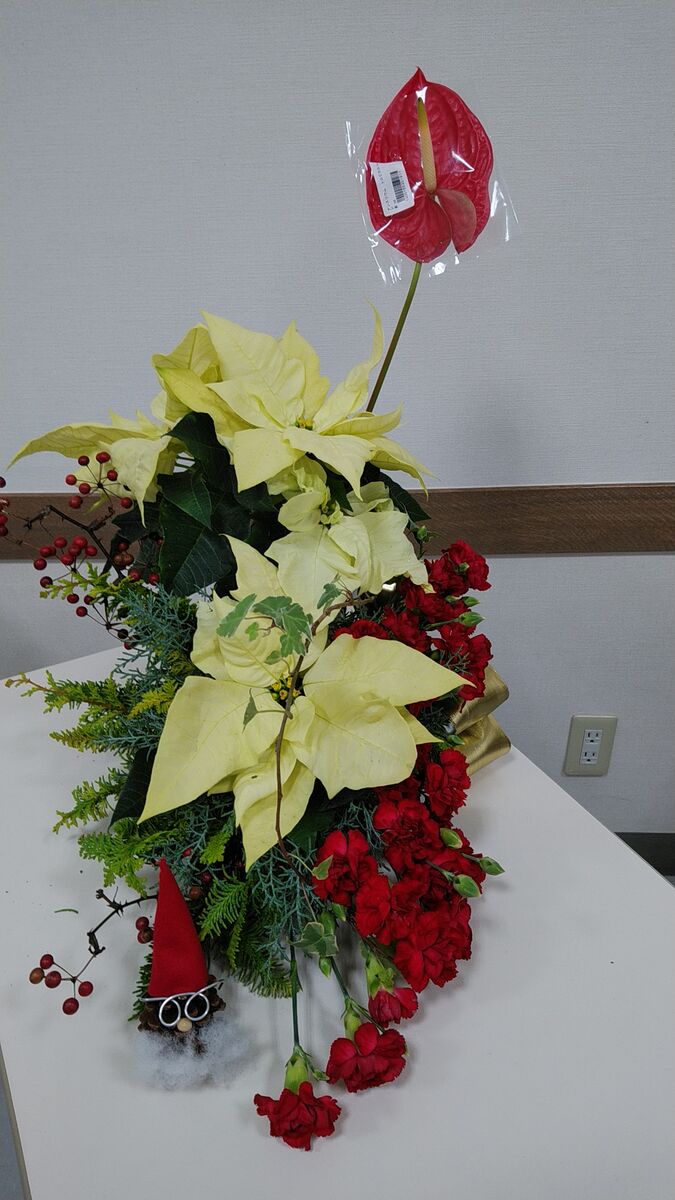 さてクリスマスのフラワーアレンジメントをお届けします。