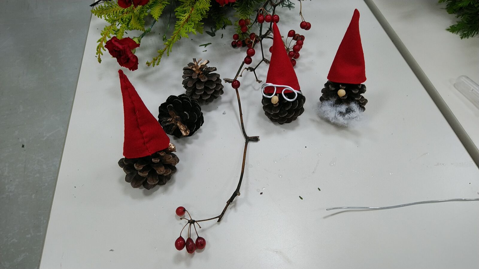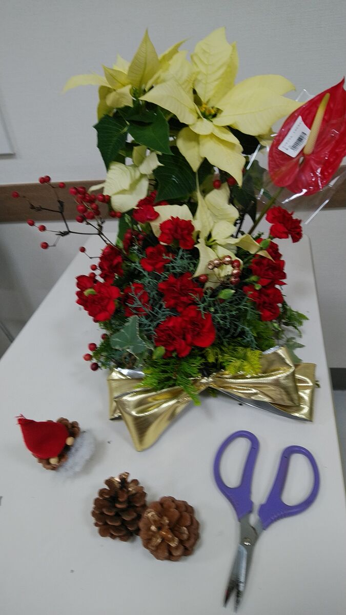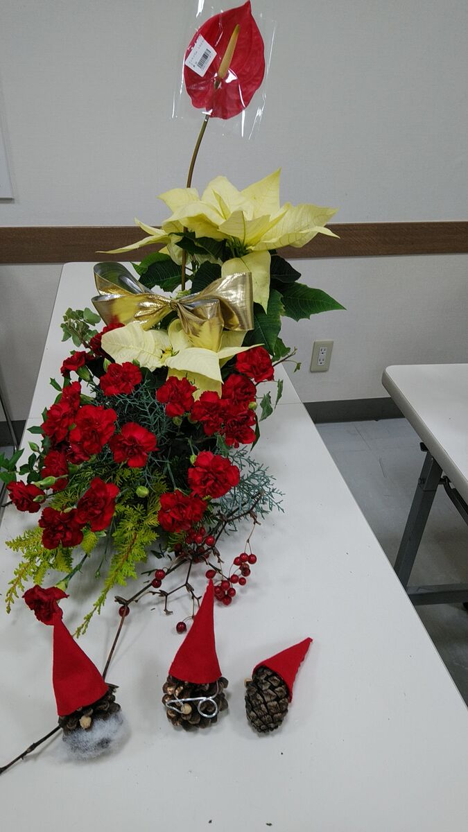 黄色いポインセチアが立派でした。真っ赤なカーネーションとのコントラストが派手でクリスマスらしい。松ぼっくりのサンタさんも可愛いです。これも手作りです。
