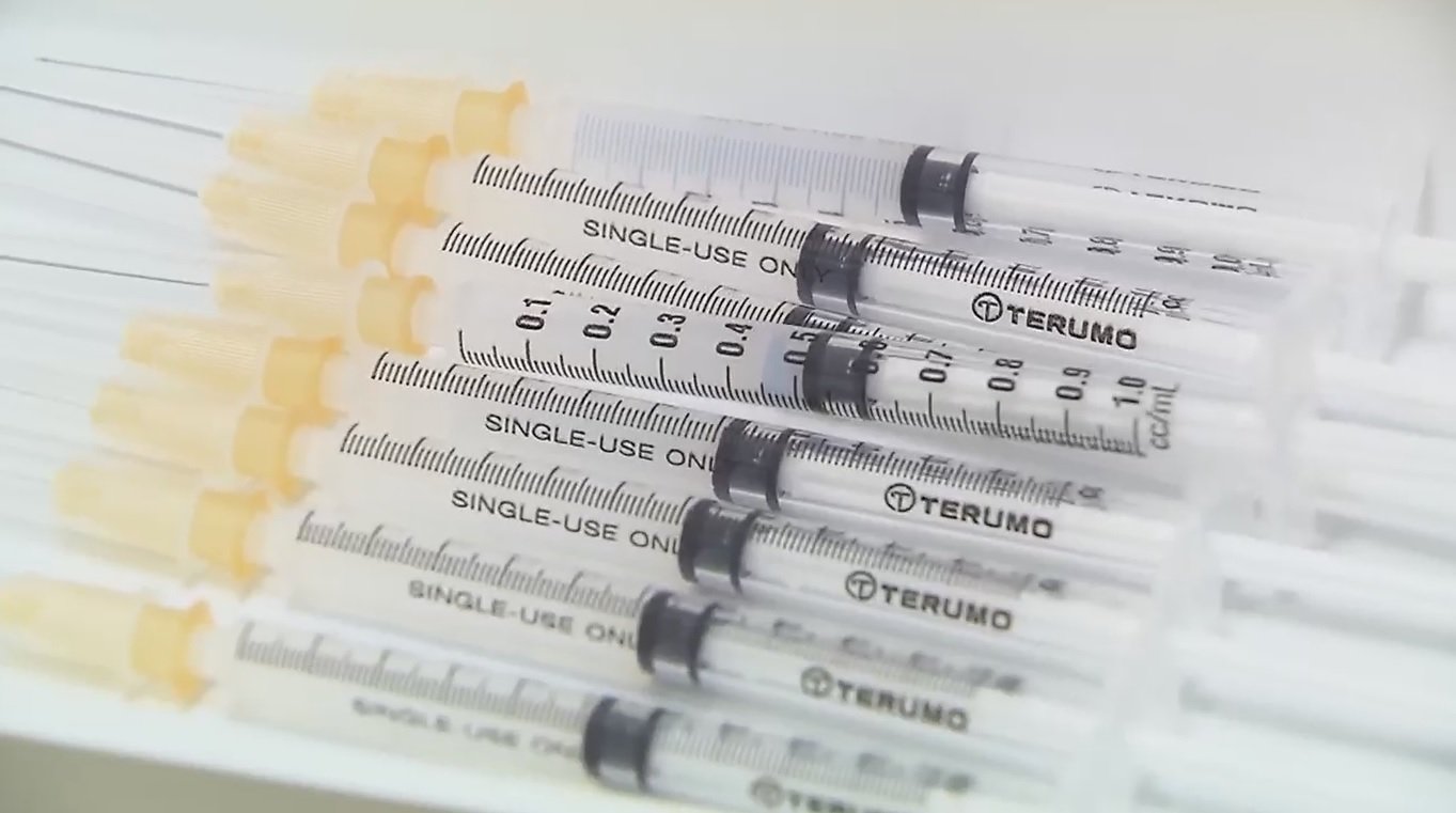 新型コロナウイルスのワクチン接種準備が整った注射器=手塚耕一郎撮影
