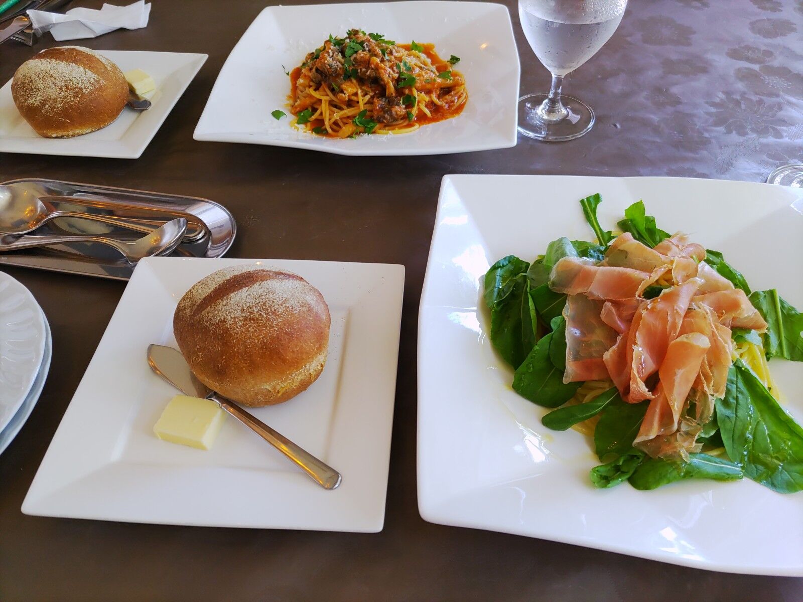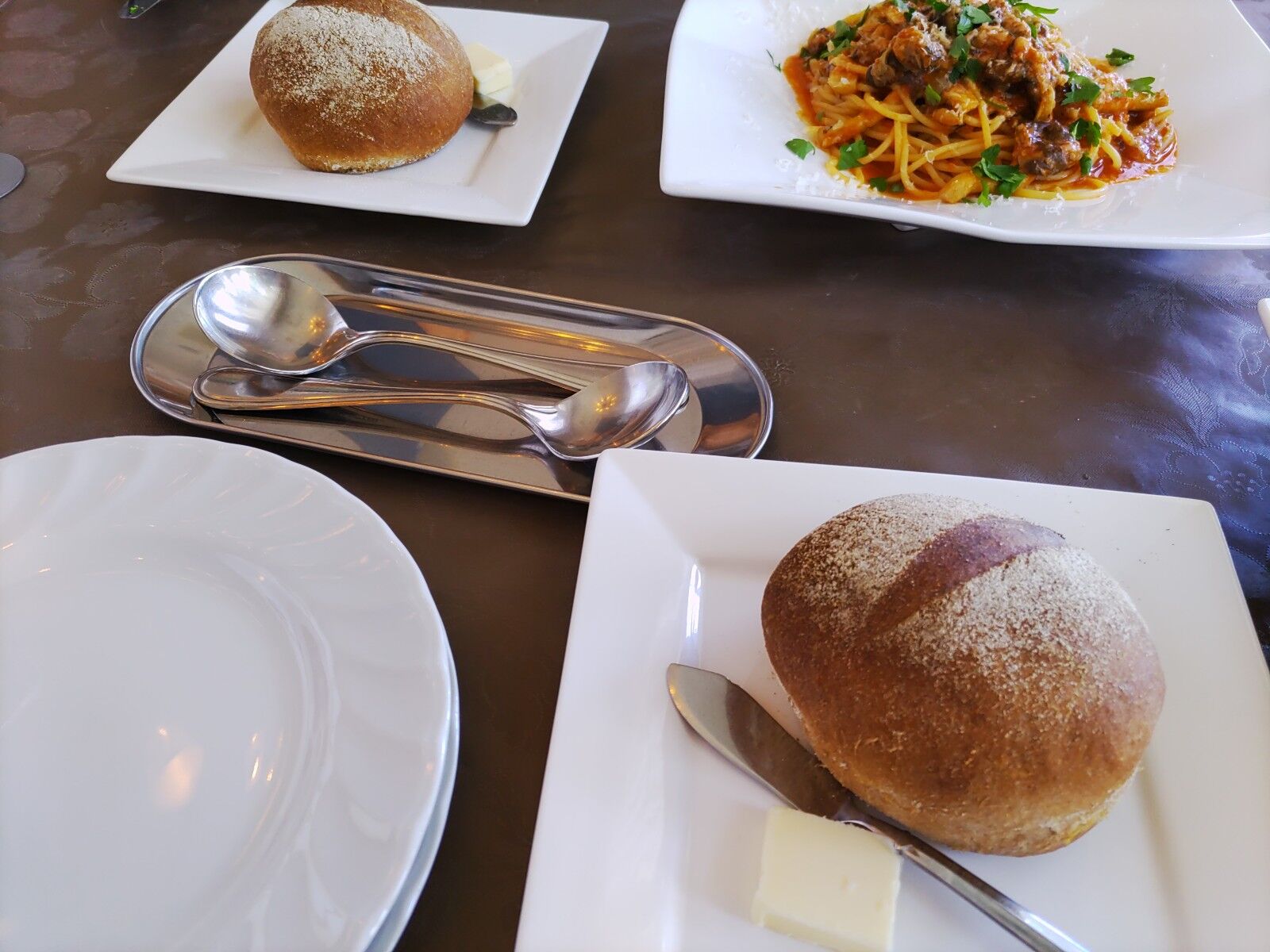 茄子とパンチェッタのアラビアータパスタだったかな? パン200円を付けて1800円