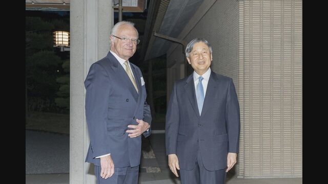 天皇陛下は午後7時ごろ、スウェーデンのカール16世グスタフ国王(79)を御所の車寄せで出迎え、「またお会いできて嬉しいです」と笑顔で握手されました。