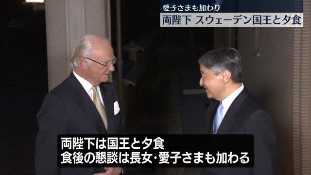 天皇皇后両陛下は、大阪・関西万博のため来日中のスウェーデン国王をお住まいの御所に招き、夕食をともにされました。食後の懇談には、長女・愛子さまも同席されたということです。