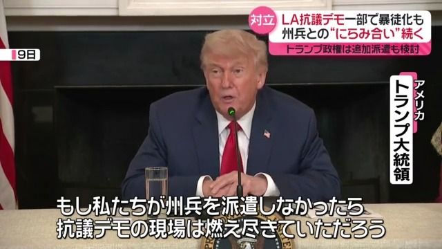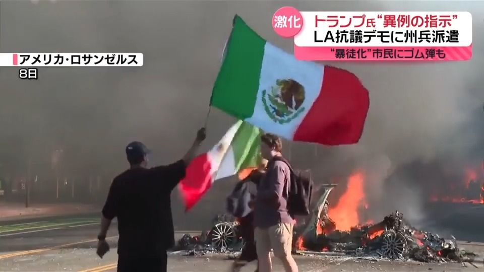 アメリカ・ロサンゼルスで、不法移民への取り締まりに抗議するデモが続いています。トランプ大統領はデモに対抗するために州兵2000人の派遣を指示するなど、混乱が収まる見通しは立っていません。