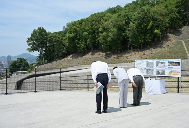小原山砂防堰堤(えんてい)で、かつて家屋があった場所に向かって黙礼する天皇、皇后両陛下=2025年6月20日午前10時47分、広島市安佐南区、代表撮影