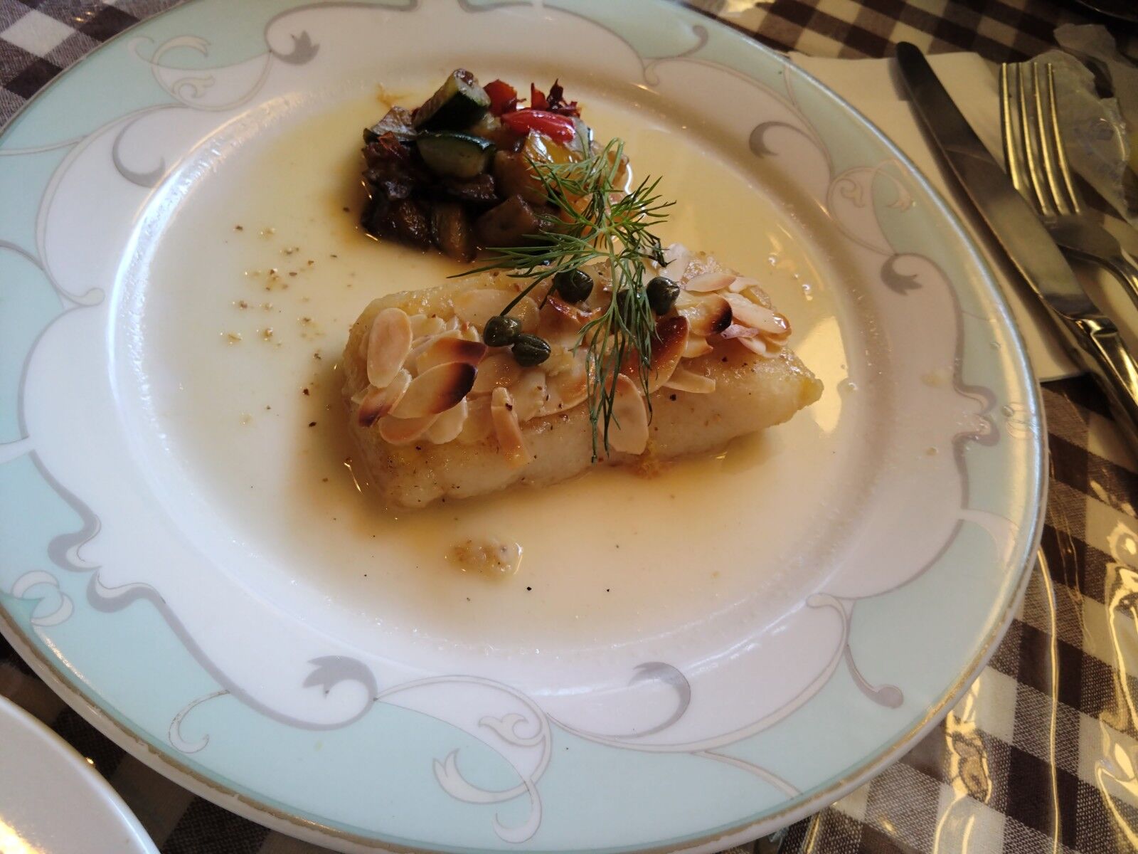 S子さんとOさんは白身魚のアーモンド焼き ケーパーバターソース 1980円(税込)を注文