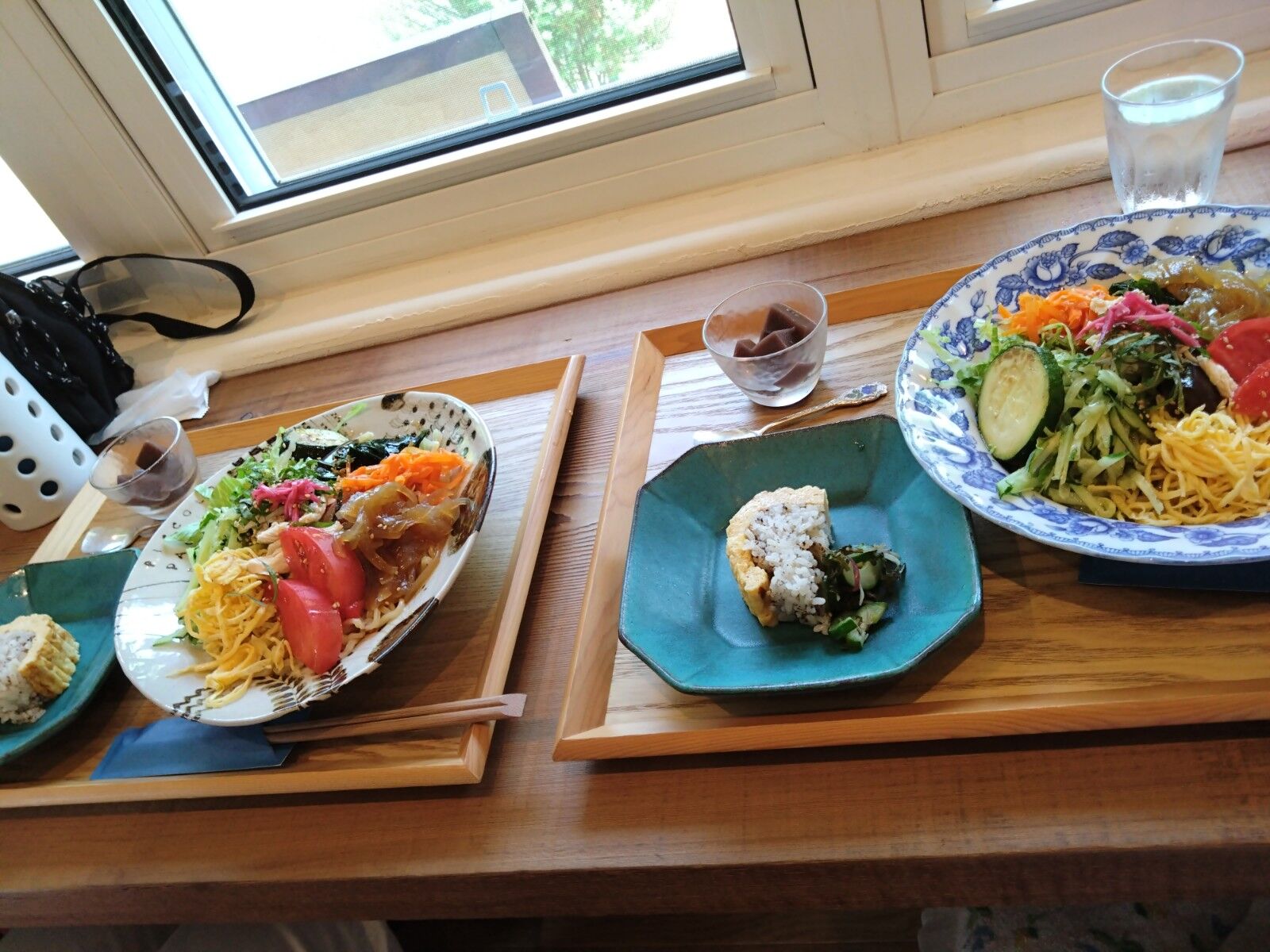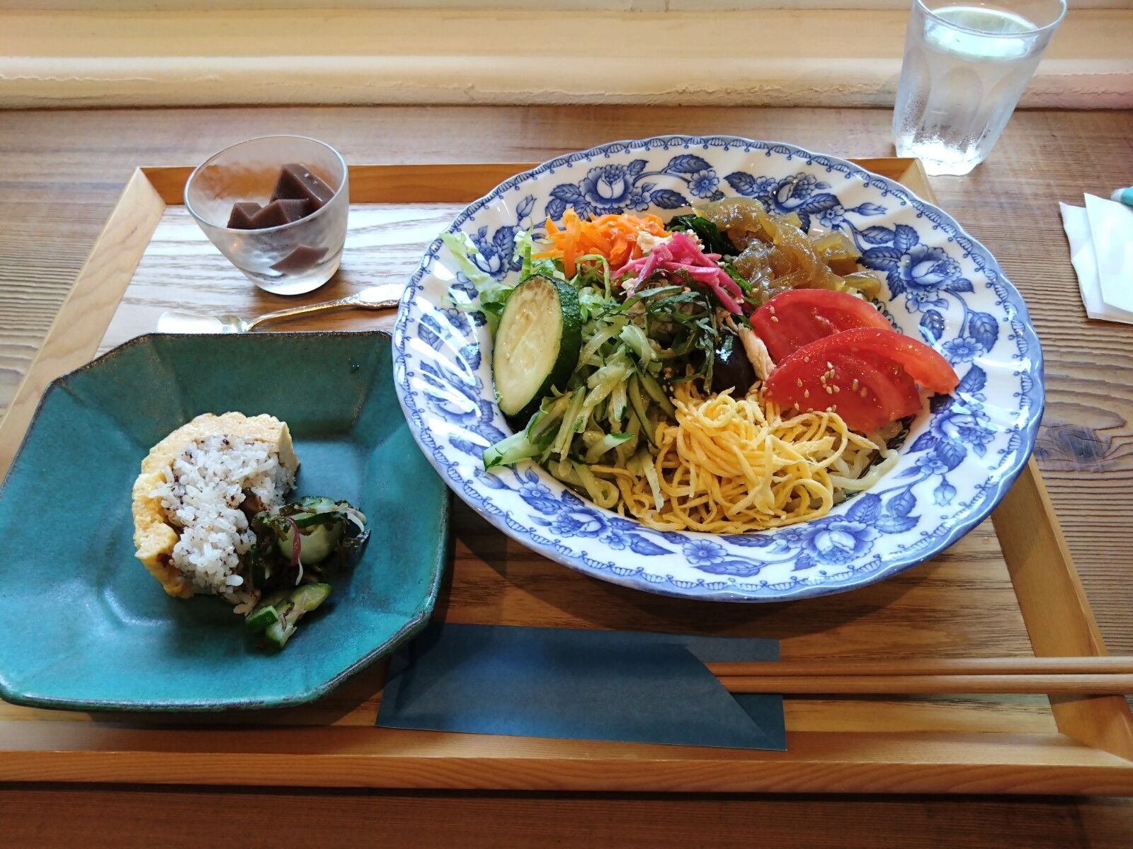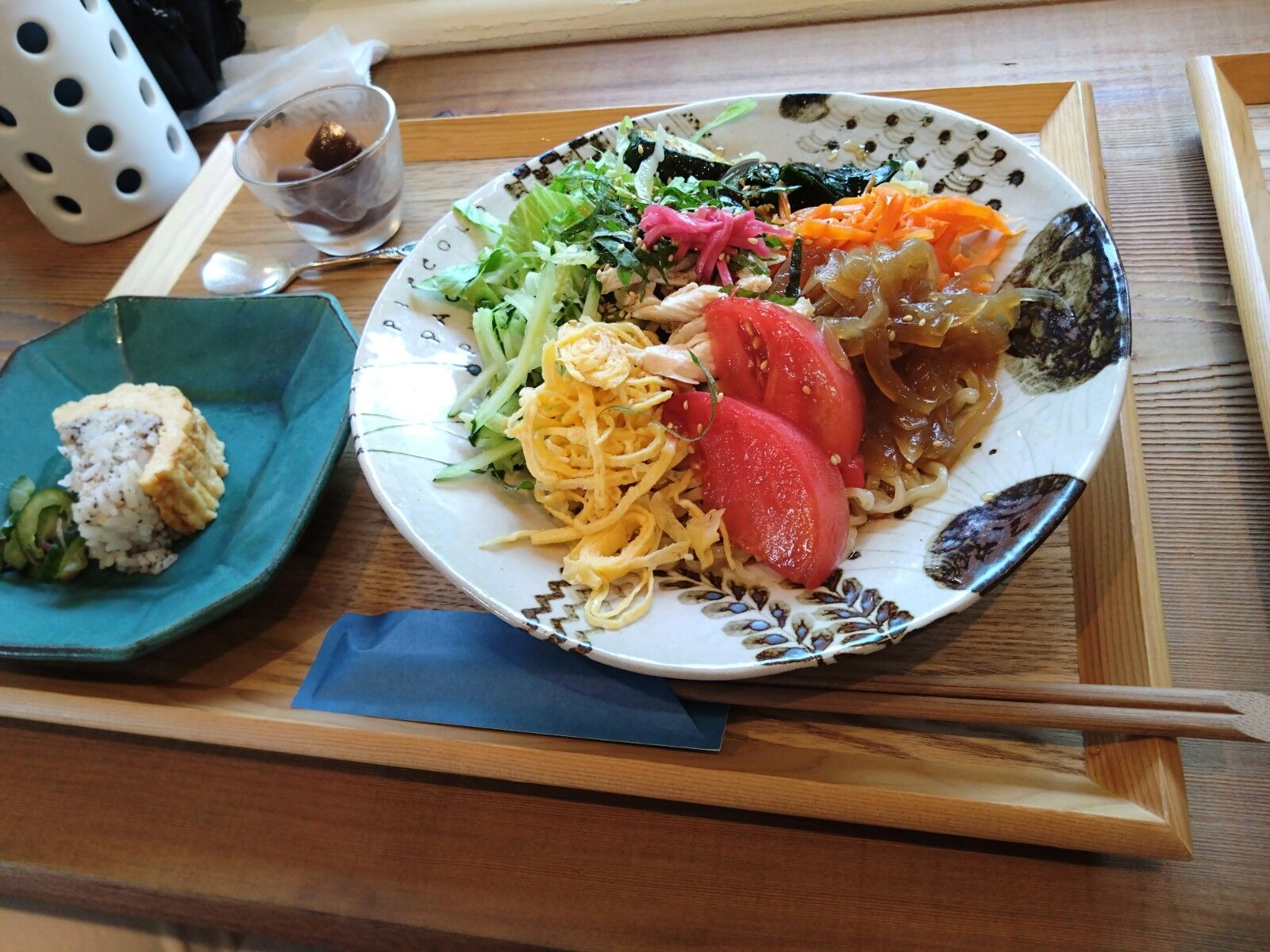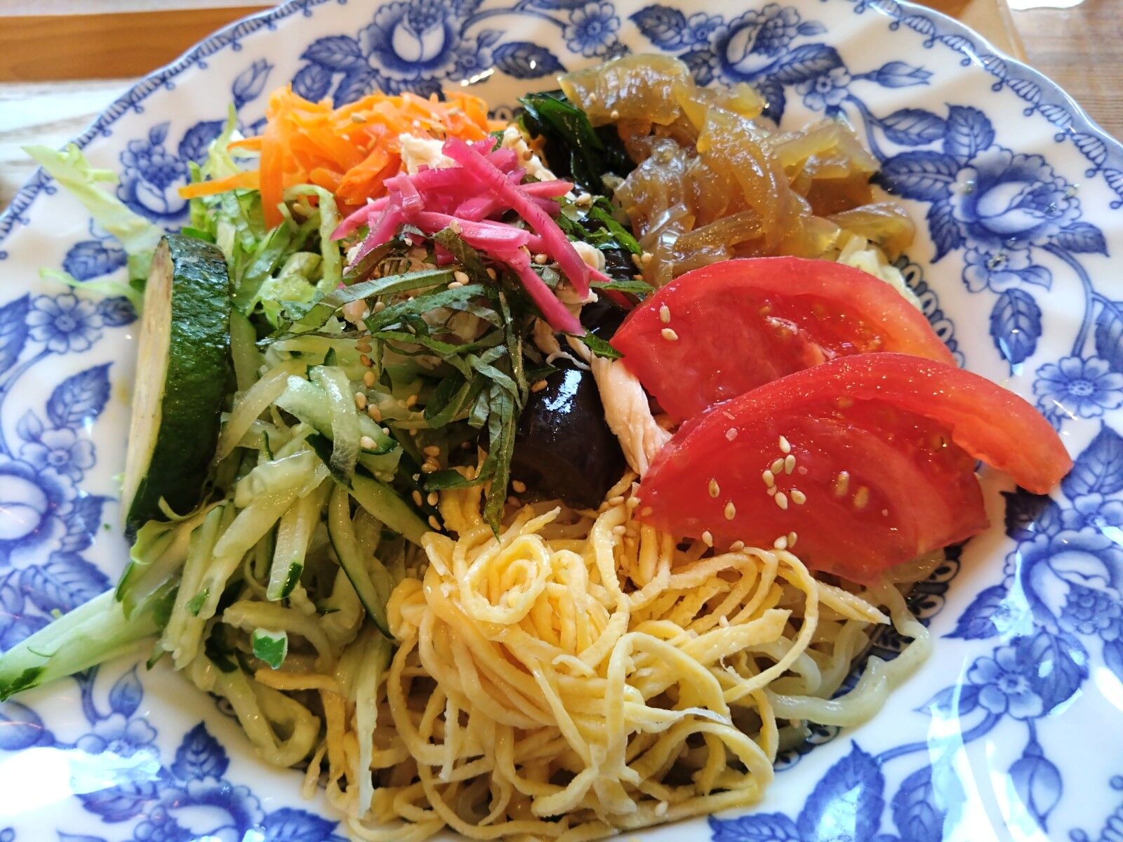 全粒粉の麺で作られた冷やし中華、セットで1900円。