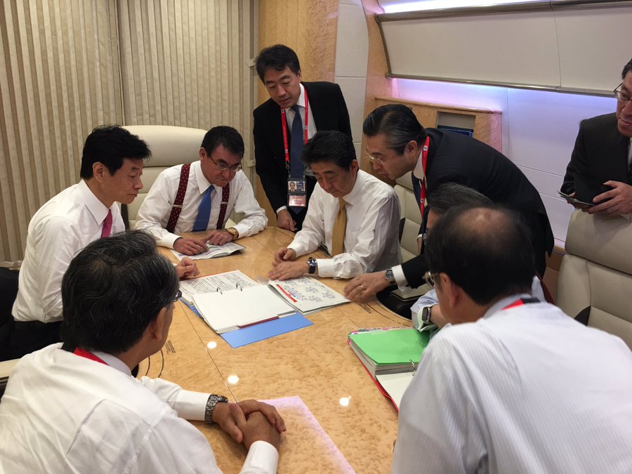 政府専用機内での打ち合わせ。 pic.twitter.com/JQcAQ4SHVu