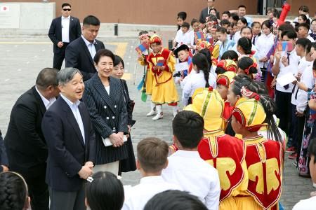 【ウランバートル共同】モンゴル訪問中の天皇、皇后両陛下は9日、首都ウランバートルの小学生から高校生までが通う公立学校を訪れ、交流された。民族衣装を着た子どもたちが歌やダンス、伝統楽器「馬頭琴」の演奏を披露し、両陛下は笑顔で拍手を送った。