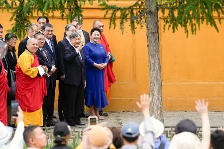 モンゴル最大規模の仏教寺院を訪れ、市民に向かって手を振られる天皇陛下=10日、ウランバートル(共同)