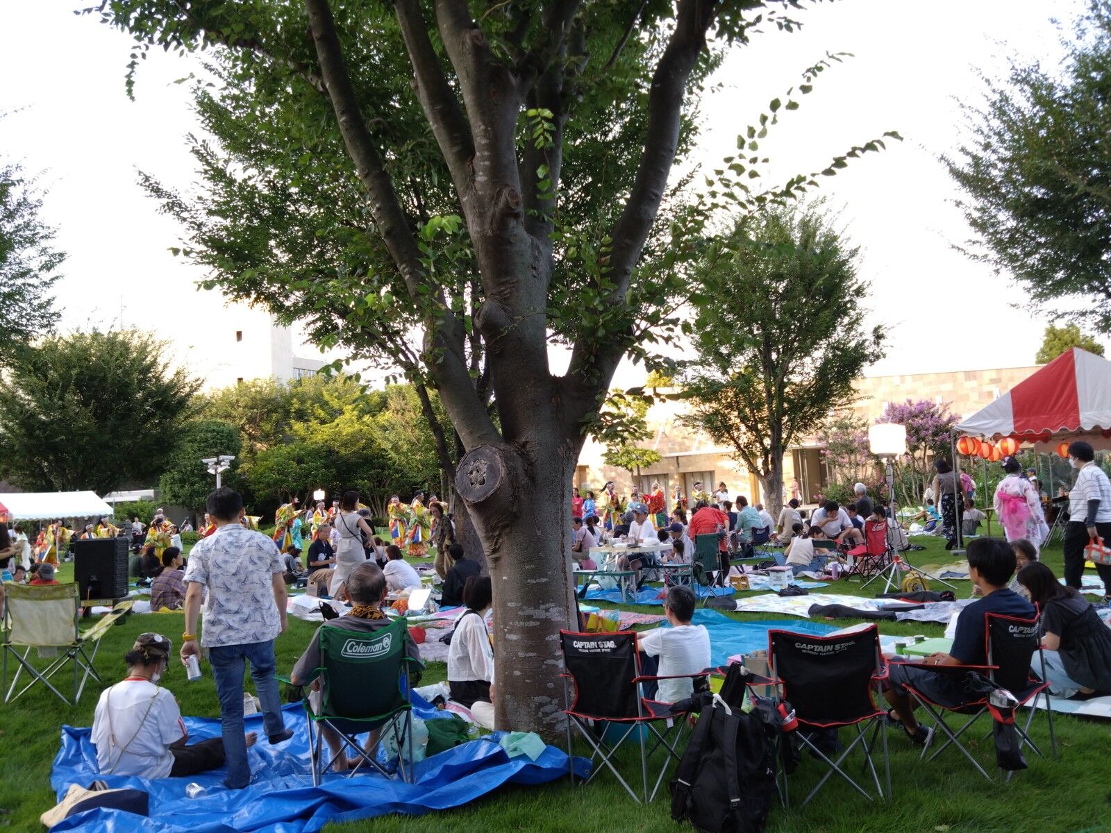焼きそば、焼き鳥、ビールや飲み物を売る模擬店も出ていて、踊りや太鼓の披露などプロの出番もある。