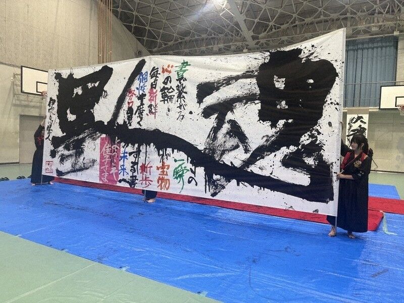 県立伊吹高校書道部「墨人」が佳子さまに向けて書いた作品=米原市朝日で、2025年10月8日午後4時17分、菊池真由撮影