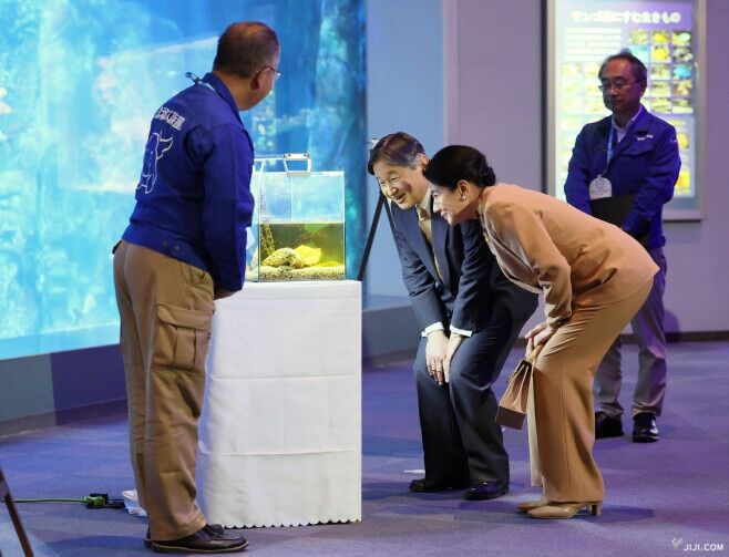 鳥羽水族館で生物多様性保全活動について担当者から説明を受けられる天皇、皇后両陛下=8日午後、三重県鳥羽市(代表撮影)【時事通信社】