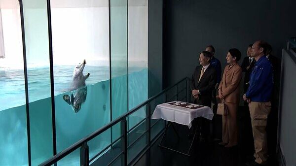 ラッコの「メイ」がガラスに貼り付けられた餌の「イカ」を取るためにダイナミックにジャンプをすると、両陛下は拍手をして喜ばれました。