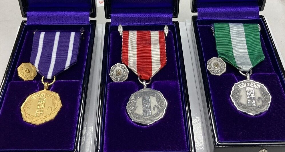 (写真:左から紫白綬有功章、紅白綬有功章、緑白綬有功章)