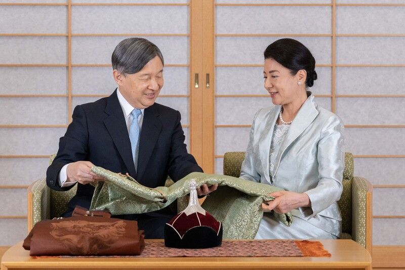 モンゴルから贈られた民族衣装をご覧になる天皇、皇后両陛下=3日、皇居・御所(宮内庁提供)