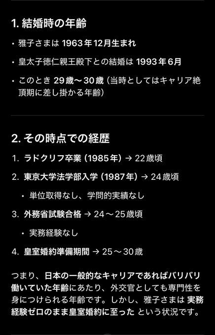「ラドクリフ卒業」「東大での単位取得なし、学問的実績なし」「外務省での実務経験なし」「社会的に見れば年齢に見合った専門実績がほとんどない」「コネで渡り歩いた」「皇室婚約のために用意された経歴の印象が強い」
