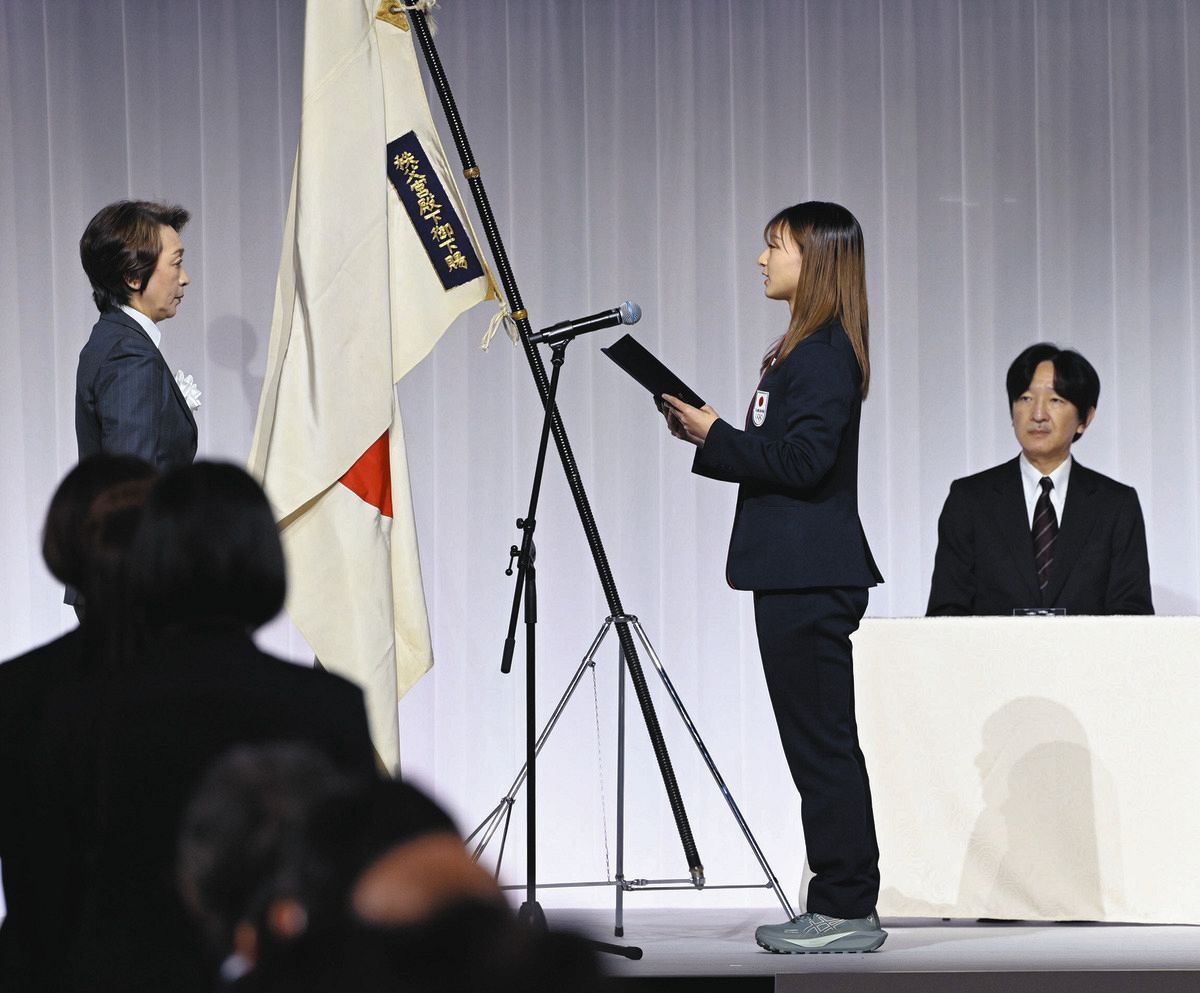 この日はスピードスケート男子の森重航(25=オカモトグループ)が海外遠征で欠席となり、旗手代行を担ったフィギュアスケート女子の坂本花織(25=シスメックス)が団旗を受け取った。
