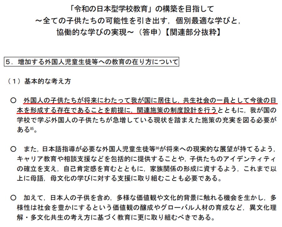 文科省の文書にある「外国人の子供たちが今後の日本を形成する」という一文。