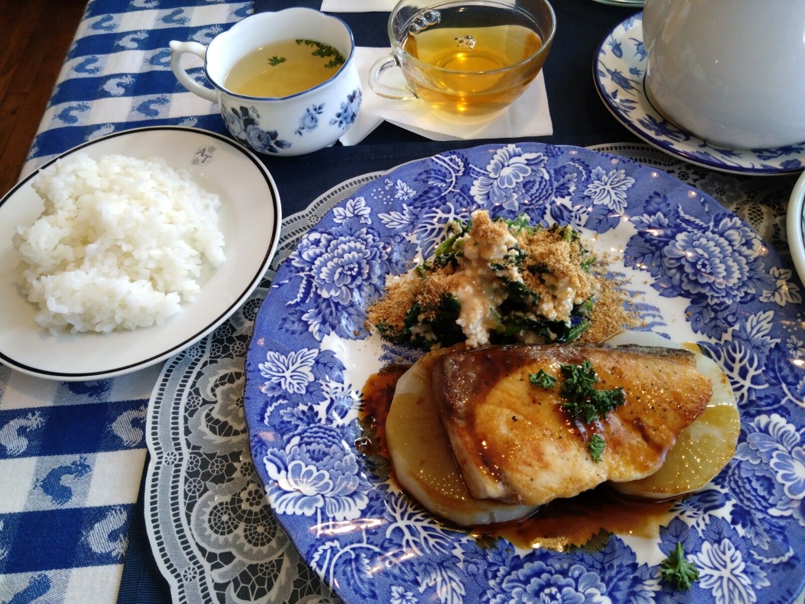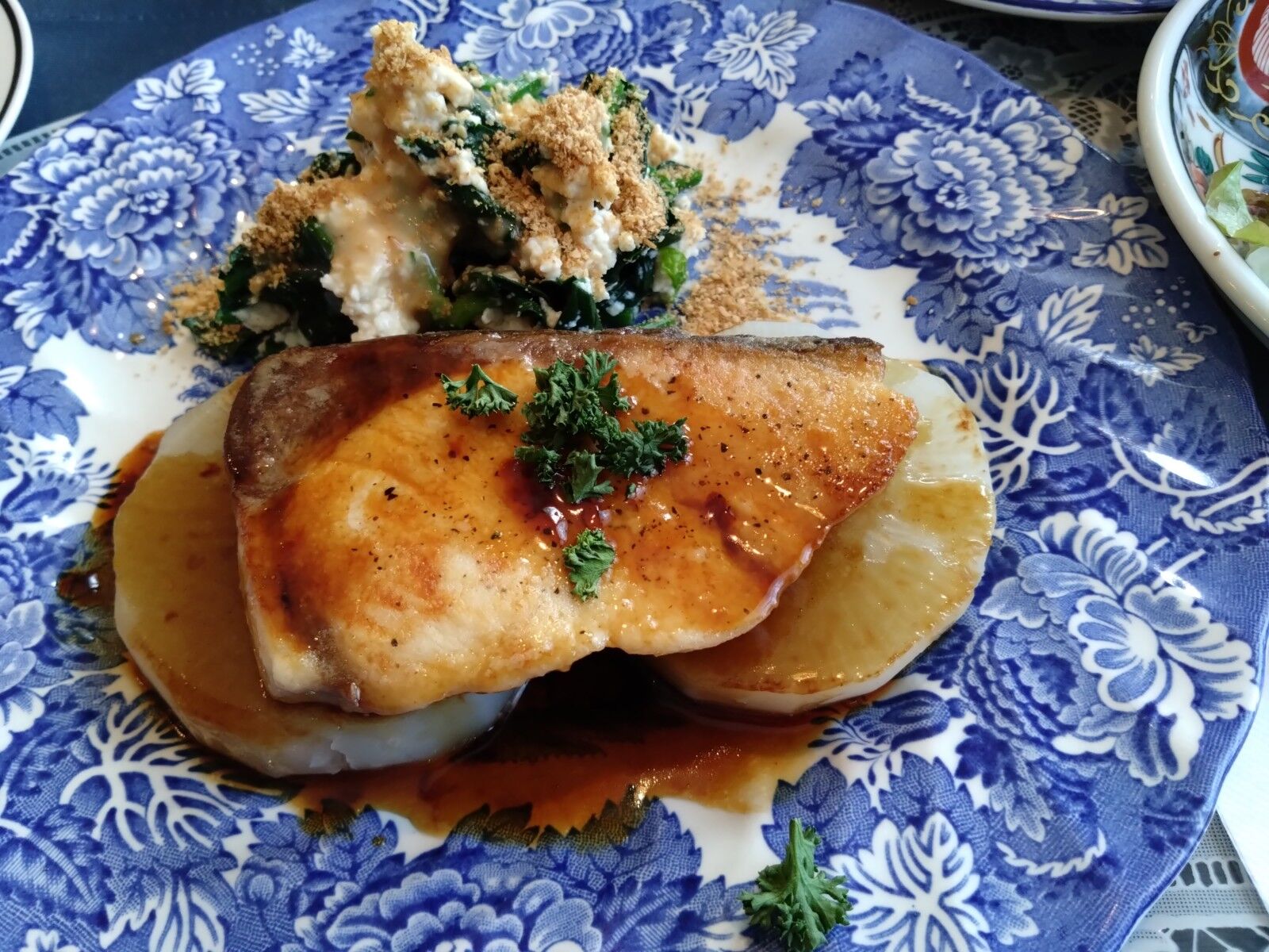 ブリの下に柔らかく煮込んだ大きな大根とほうれん草のゴマサラダがとっても美味しい!