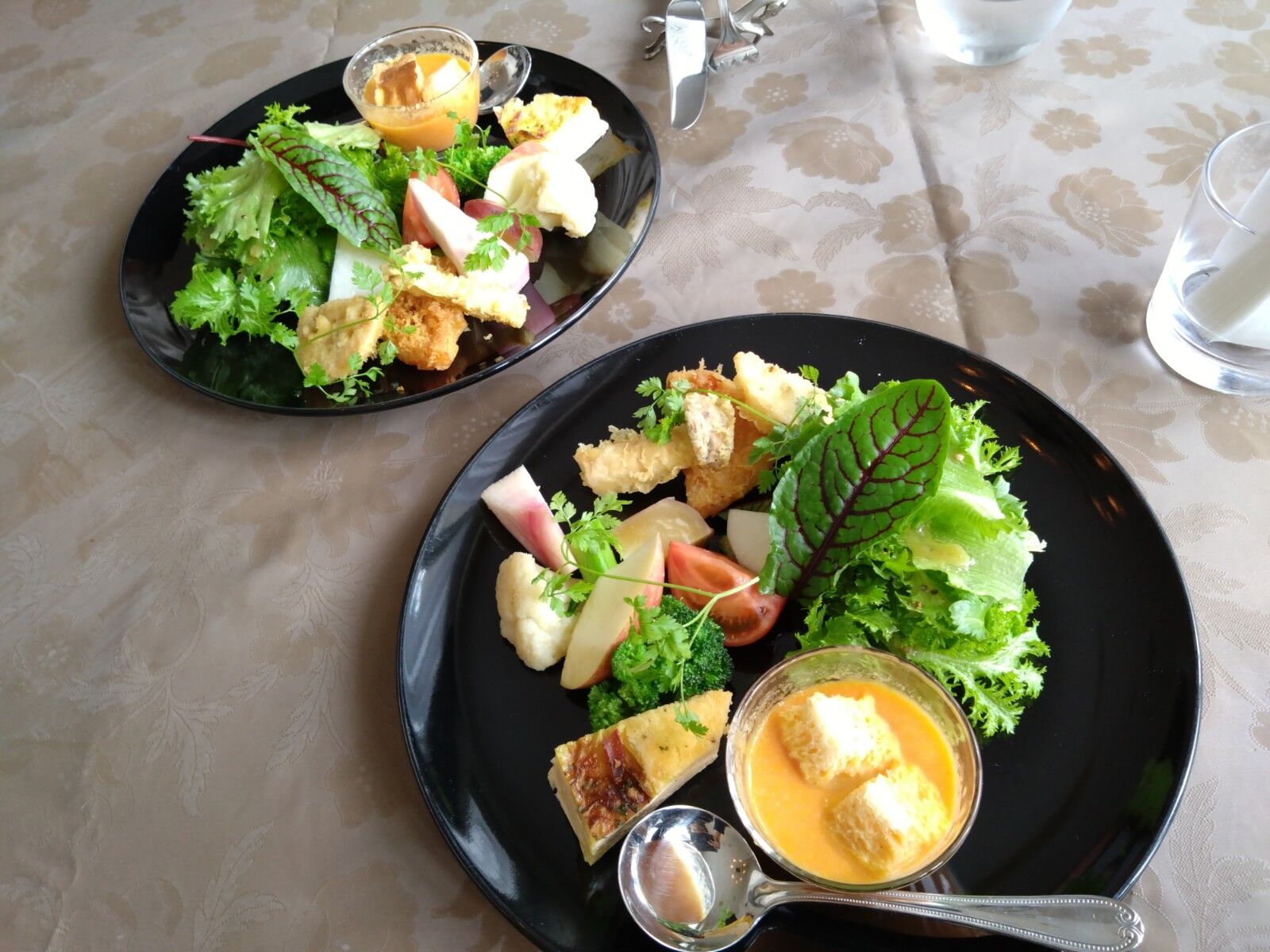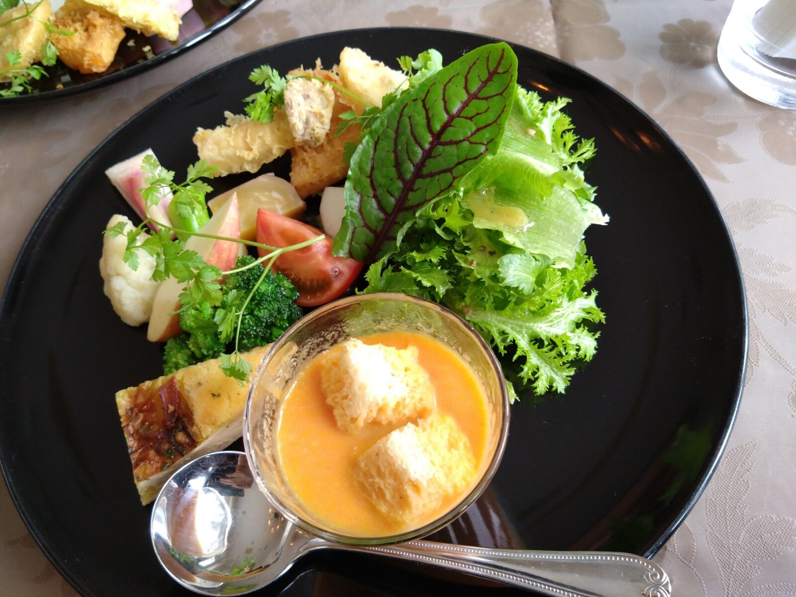 まずは楽しみなサラダ、温かいスープと野菜の天ぷらが付いている。