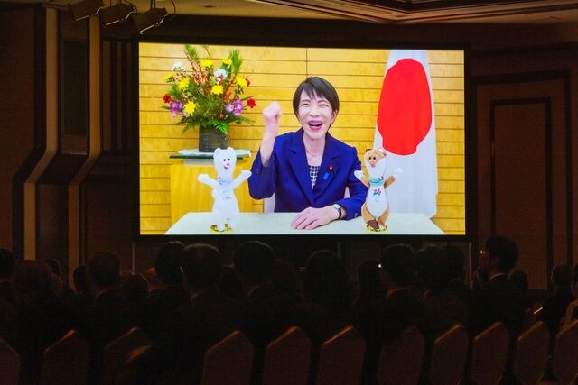 内閣総理大臣の高市早苗氏からの激励のビデオメッセージが紹介され、「頑張れ日本」とエールを送った(撮影:越智貴雄)