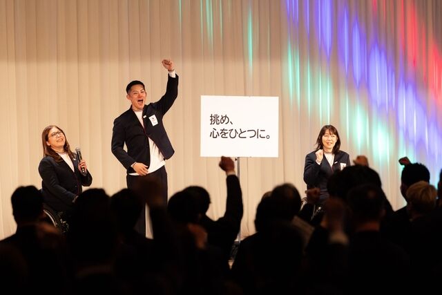 大会スローガン「挑め、心をひとつに。」が発表され、会場が一体となった(撮影:越智貴雄)