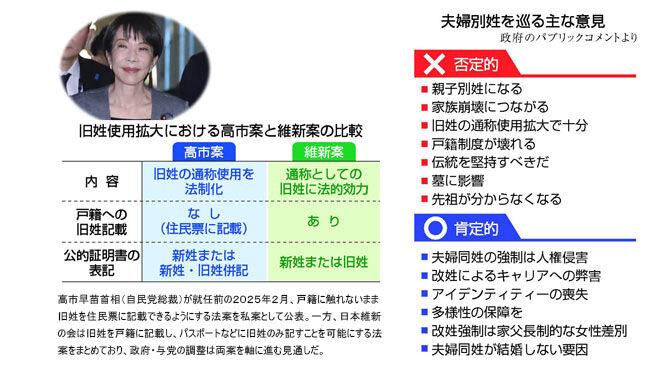 政府・与党は、結婚に伴って姓を変えた人による旧姓の通称使用を法制化する方向で調整。自民党と日本維新の会による連立政権合意書は「旧姓使用法制化法案を2026年通常国会に提出し、成立を目指す」と明記している。ただ、旧姓使用の法制化は現行の夫婦同姓制度を維持することが前提となるため、選択的夫婦別姓制度の導入を主張してきた野党からは反発の声も。別姓導入論は自民内にも根強く残っており、法制化までには曲折も予想される。