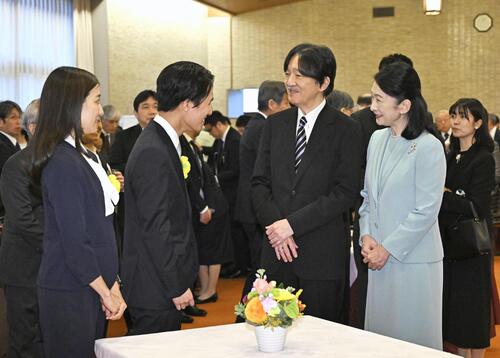 日本学術振興会が設けた「育志賞」の受賞者らと懇談される秋篠宮ご夫妻(代表撮影=共同)
