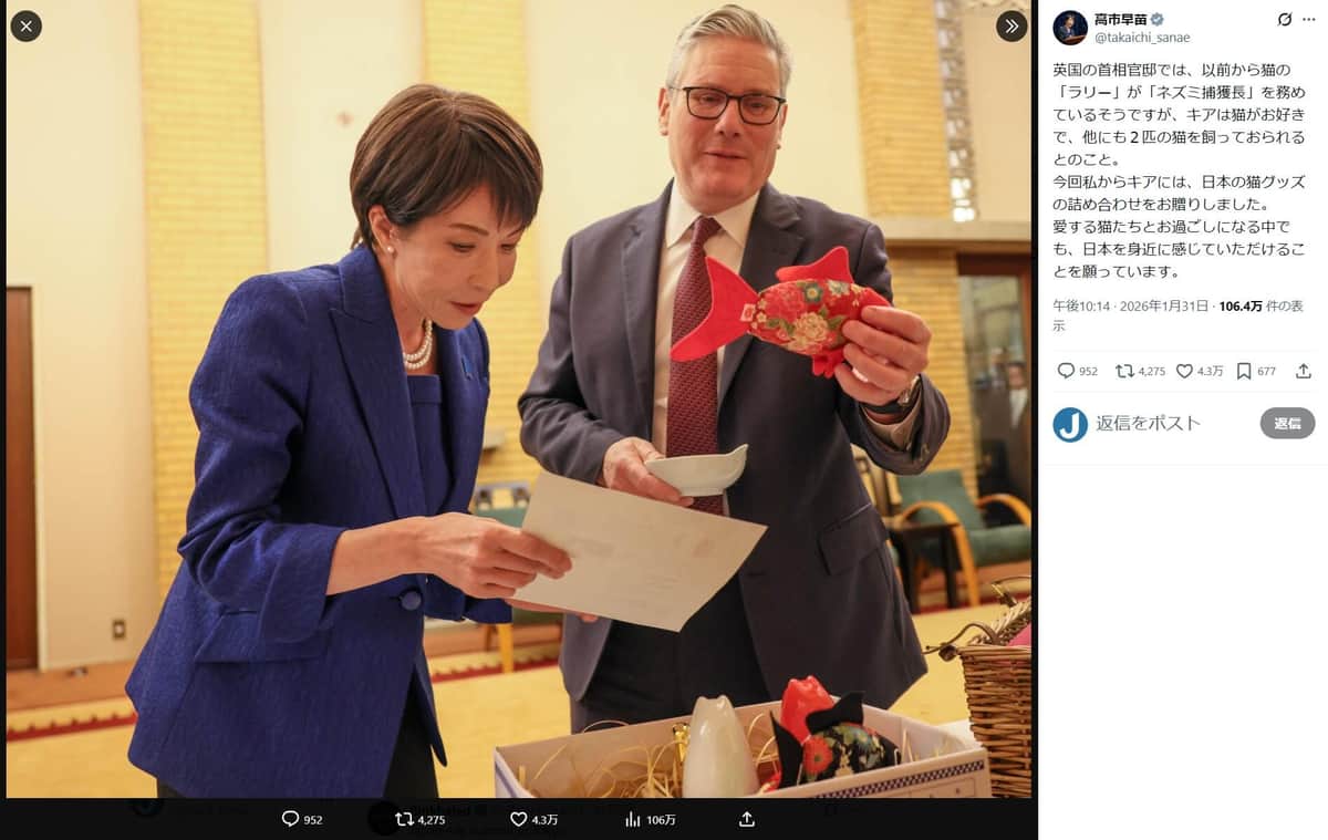 高市早苗首相が2026年1月31日、訪日中のキア・スターマー英国首相へのプレゼントをXに投稿し、ネットの注目を集めている。