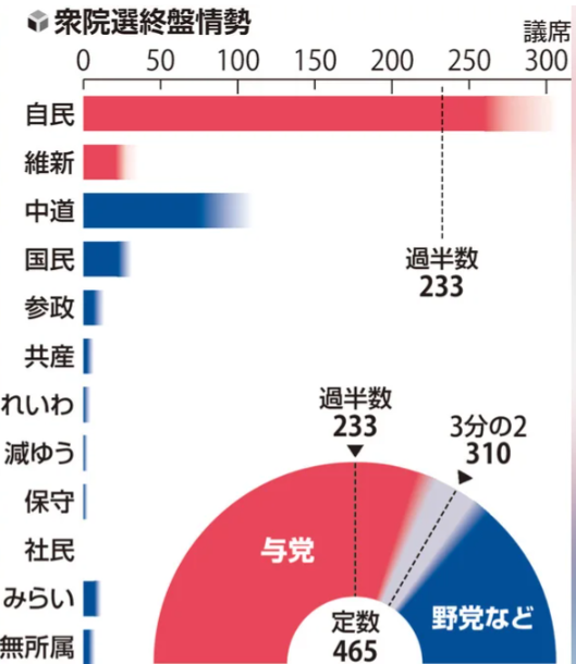 自民党は追加公認を加えて単独で316議席を獲得し、衆議院全体465議席の3分の2を超えました。衆議院で一つの政党が3分の2以上の議席を獲得するのは戦後初めてです。